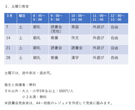 3月の土曜日教室の予定